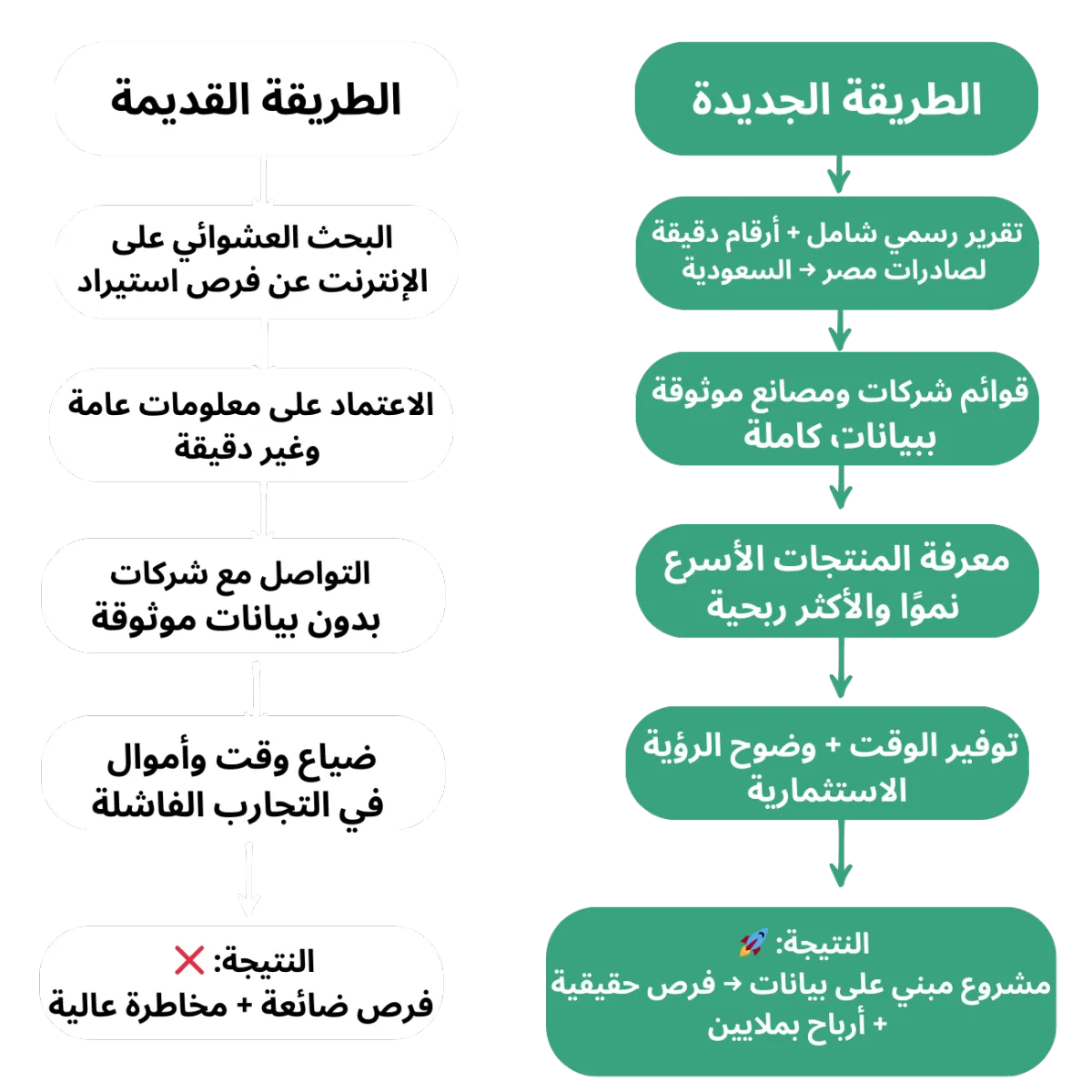 💡 ببساطة: استهداف السعودية + موردين مصريين = مزيج ذكي يفتح فجوات سوقية بملايين الريالات.